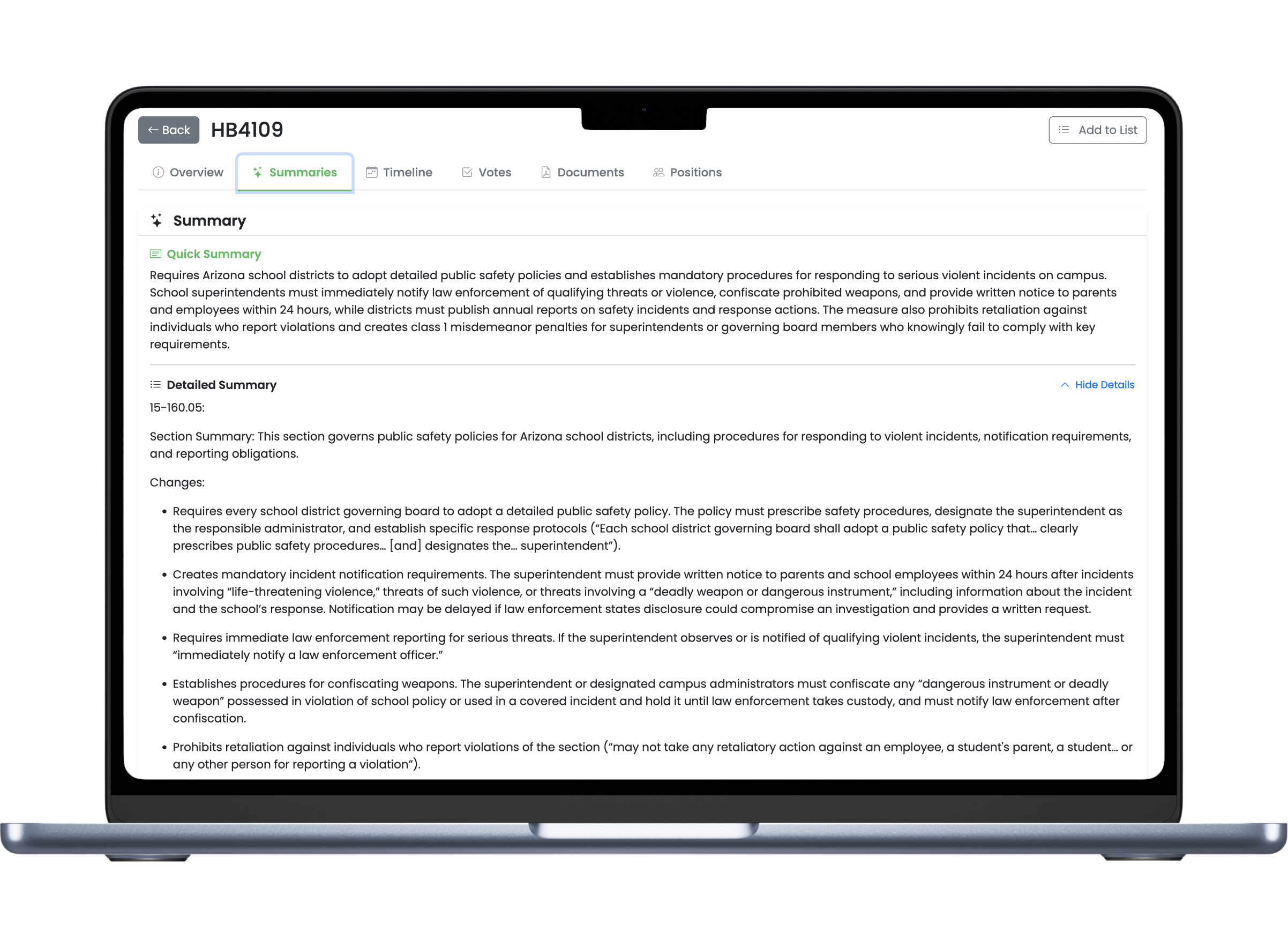 Track bills, amendments, votes, and timelines all in one place. Customize how you monitor legislation so you only see what matters most to your organization.